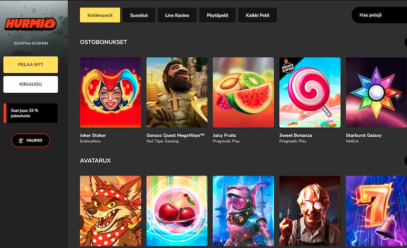 Hurmio tarjoaa monipuolisen ja viihdyttävän peliaulan, joka kattaa satoja moderneja nettipelejä eri pelistudioilta. Sivuston pelivalikoima keskittyy erityisesti laadukkaisiin kolikkopeleihin ja jännittäviin live-peleihin, mutta mukana on myös kevyitä pikapelejä ja uusimpia crash-mekaniikalla toimivia pelejä.